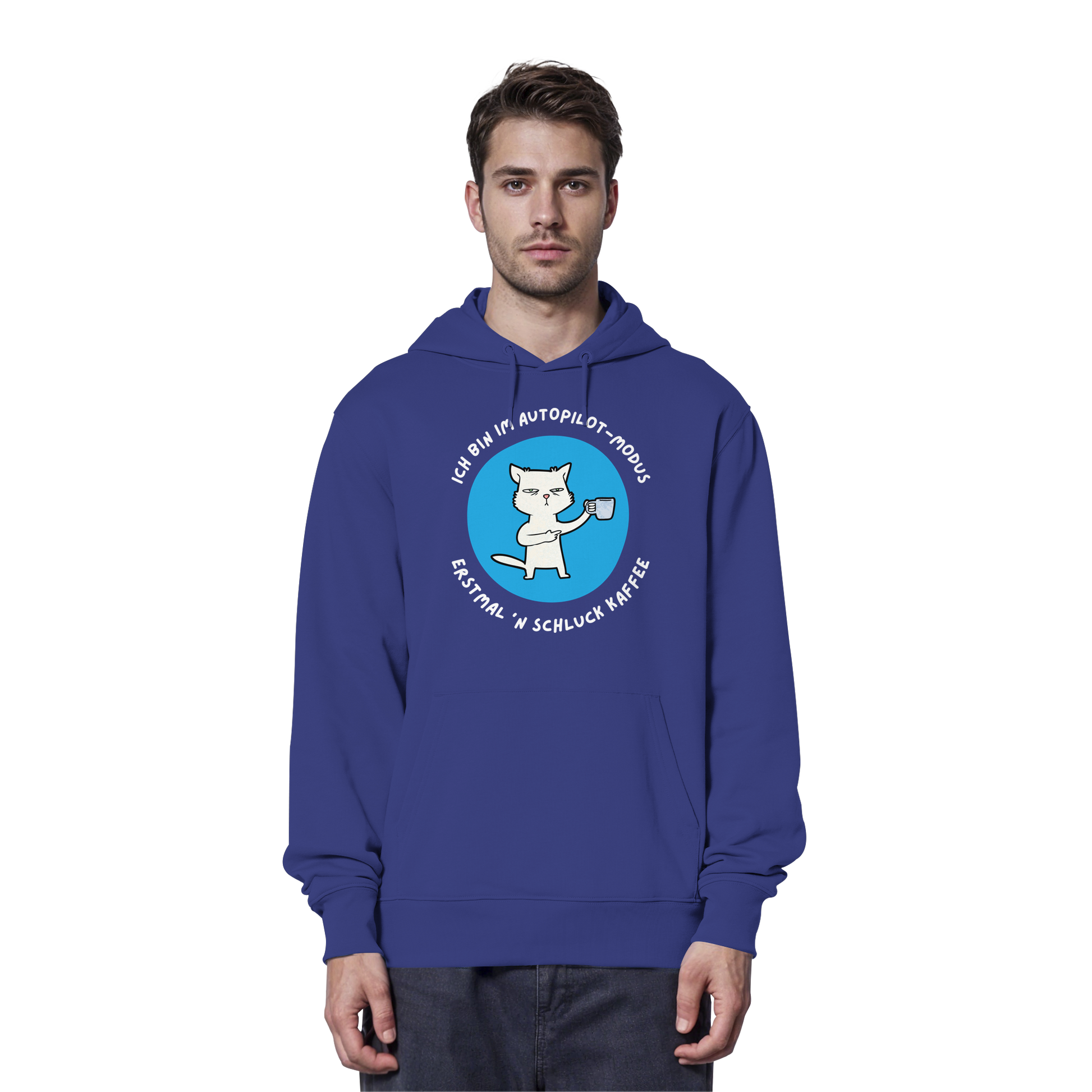 Mürrische Katze. Kaffeetasse in der Pfote. Kein Bock auf gar nix – außer auf den nächsten Schluck. Dieses minimalistische Cartoon-Design ist perfekt für alle Morgenmuffel, Kaffeejunkies und Menschen im Autopilot-Modus. Ideal für T-Shirts, Hoodies oder Becher, die genau das sagen, was du denkst.