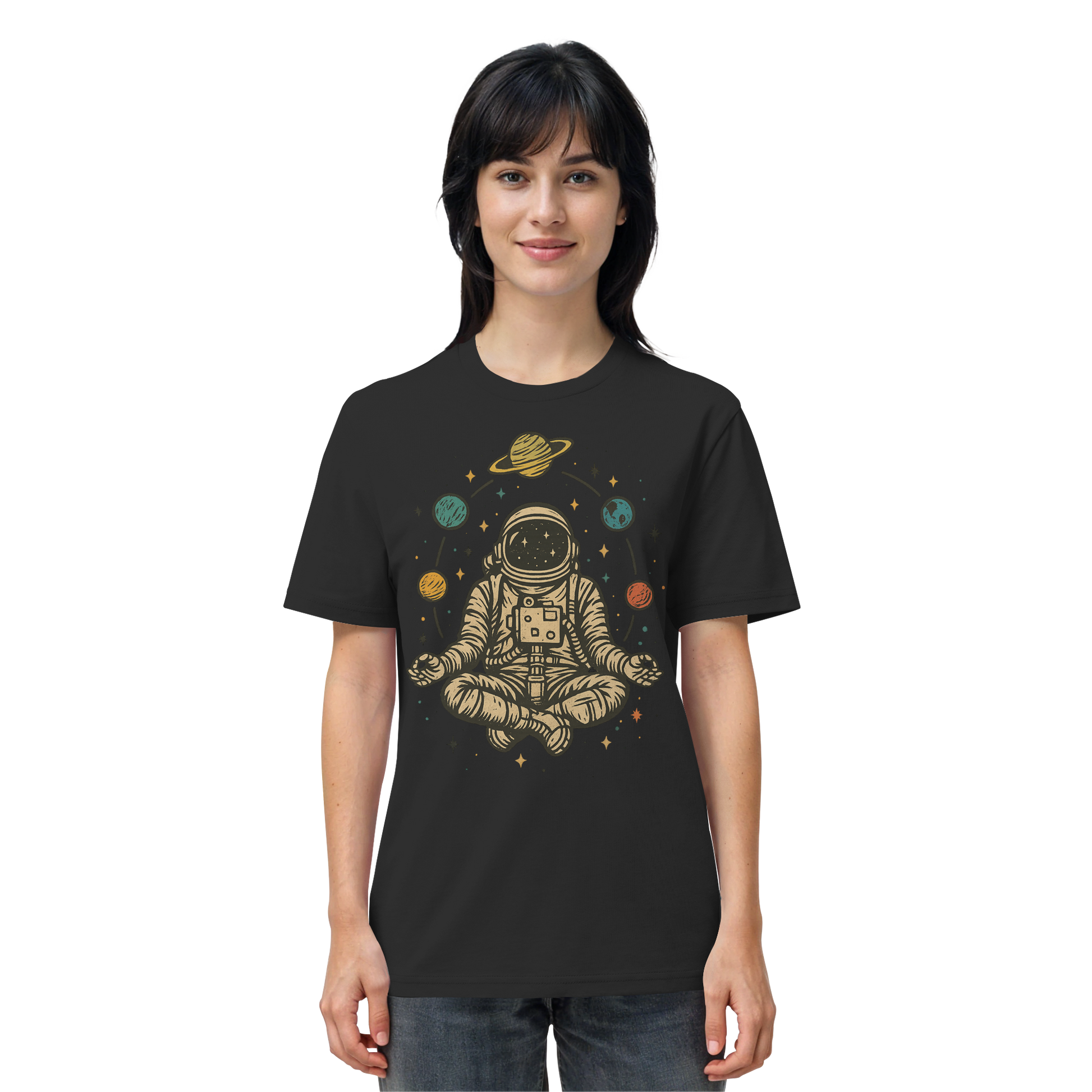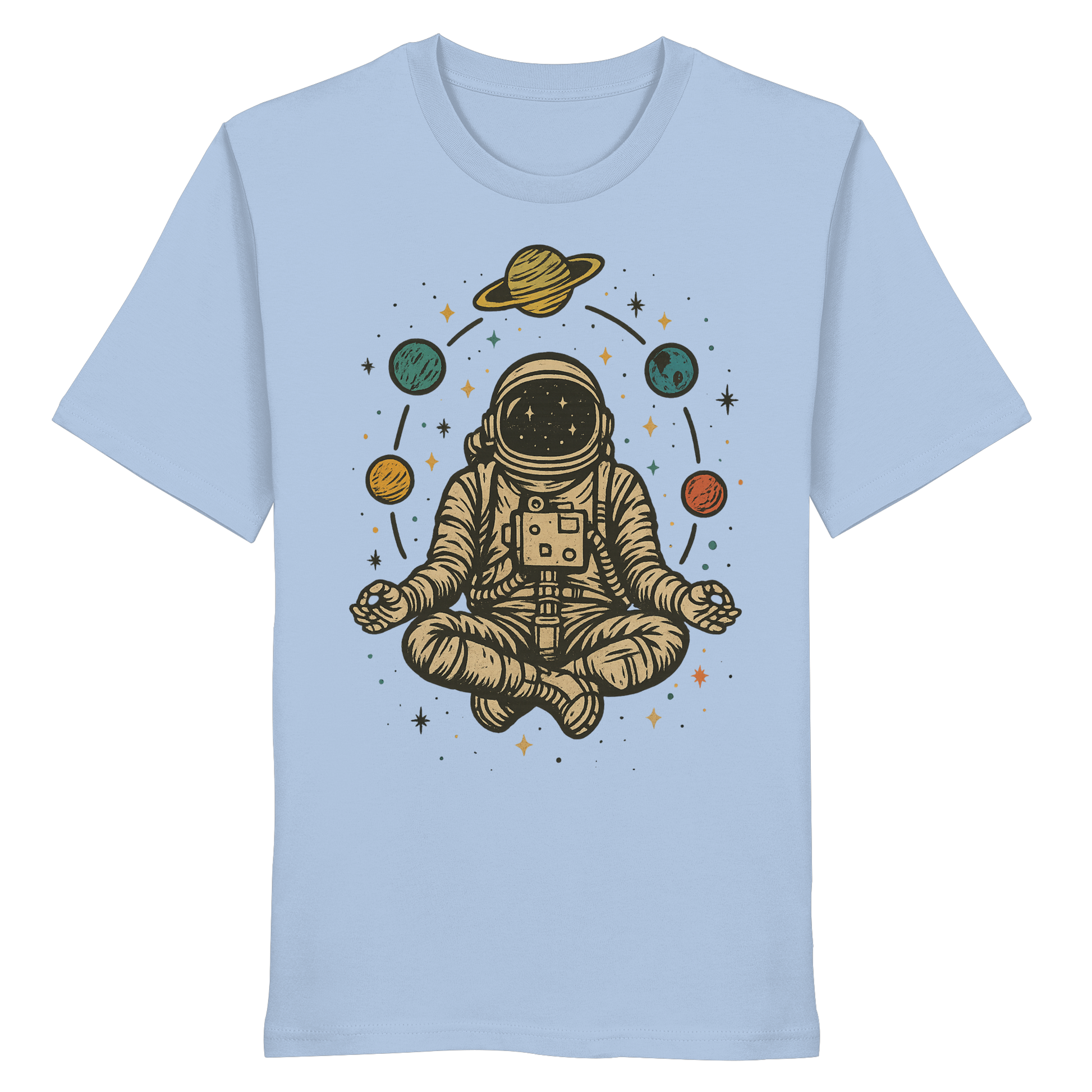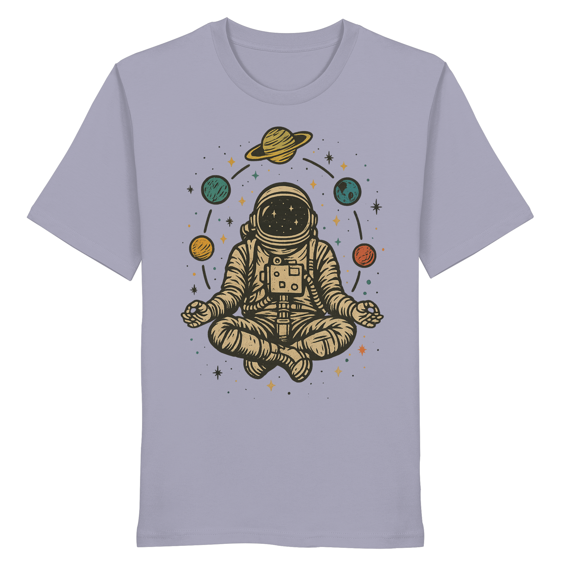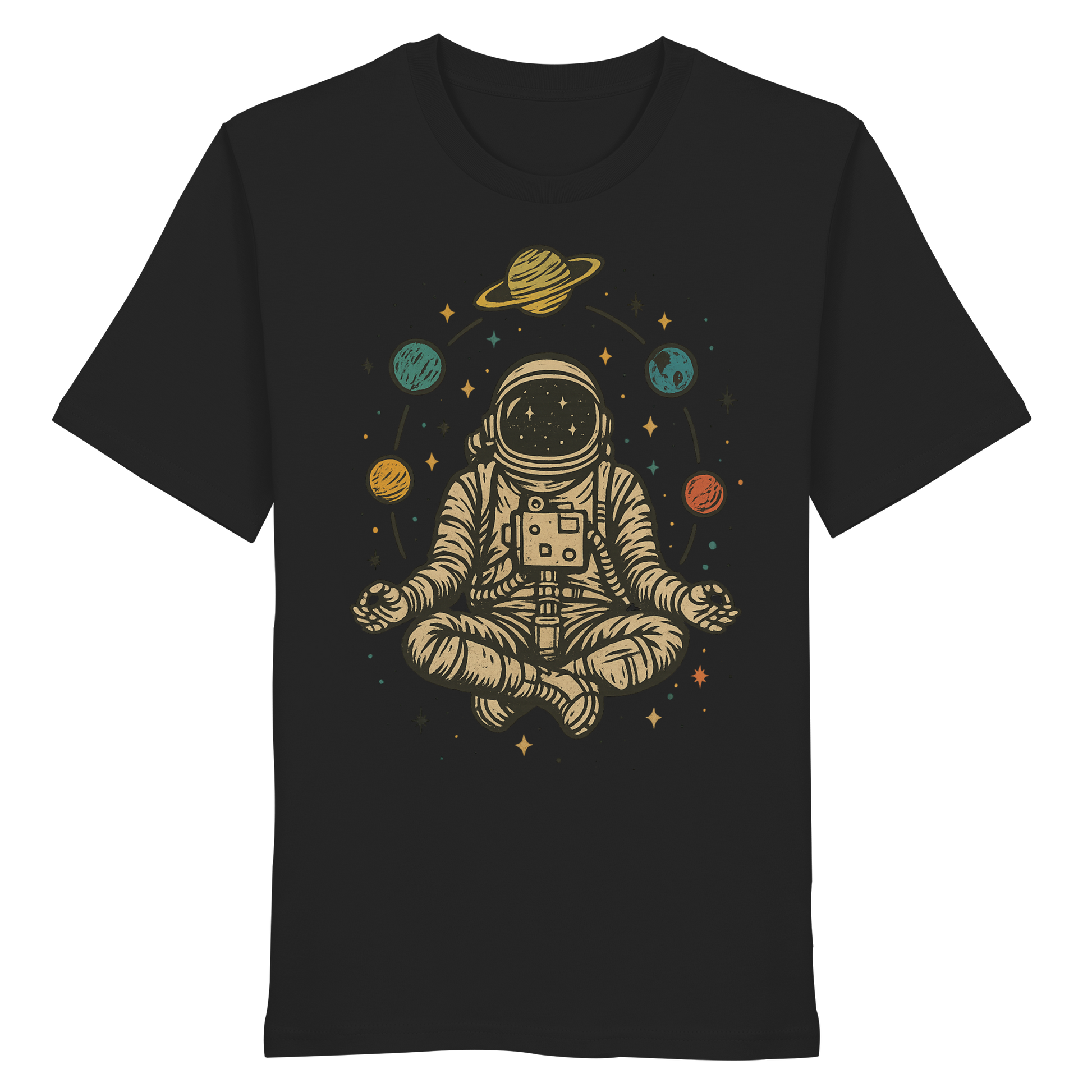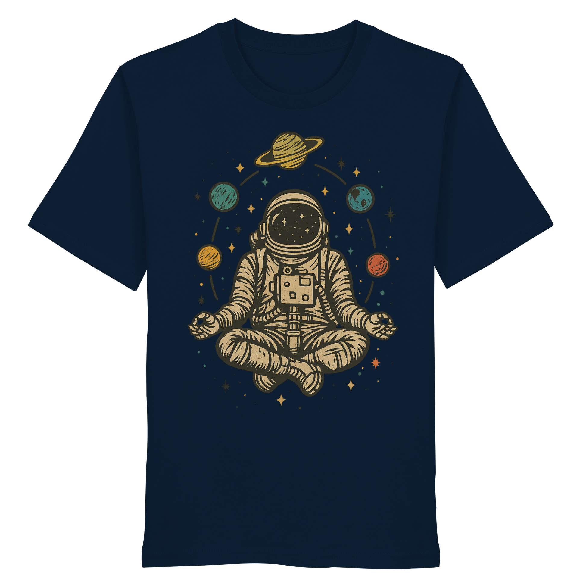 Astronaut im Vintage-Stil im Lotussitz mit Planeten und Sternen. Perfekt für Weltraumliebhaber, Yogis und Meditationsfans. Tolles Geschenk für Männer, Frauen, Teenager und Kinder, die Spaß an Yoga, Astronomie und dem Universum haben. Entworfen von Yoga Astronaut Meditation